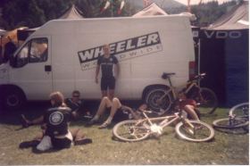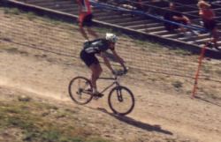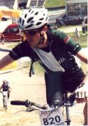 Nach dem Gegenverkehr wieder alleine auf der steilen Rampe. Originalszenen aus den Tour-Videos von 2001 rasen durch meinen Brägen. Wie sagte Toni R. zu Freund Klaus A. und Carsten M. auf die Frage, wie man das Bergfahren trainiere? "Jo, do musch' am Berg trainieren!". Es ist jetzt 12:30 Uhr und hat fast 30°C im Schatten, Gehirngoulasch vom Feinsten. Axel ferngesteuert, yes, jetzt bin ich voll in ‚der Zone' , ein geiles Gefühl! Der nächste Downhill in Richtung letzter Verpflegung, an der es nur für einen Becher Wasser über den bräsigen Bränki Dingsbums reicht.