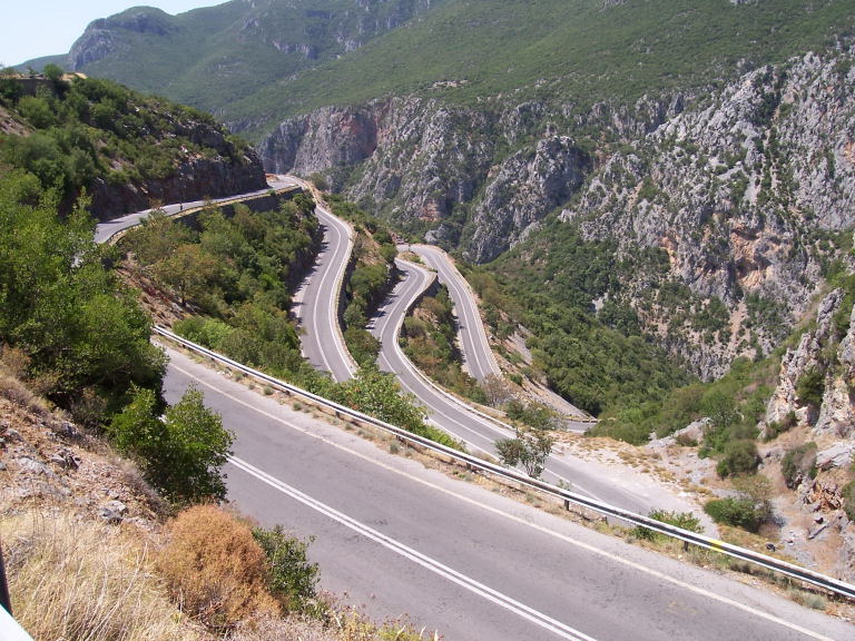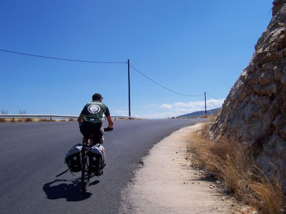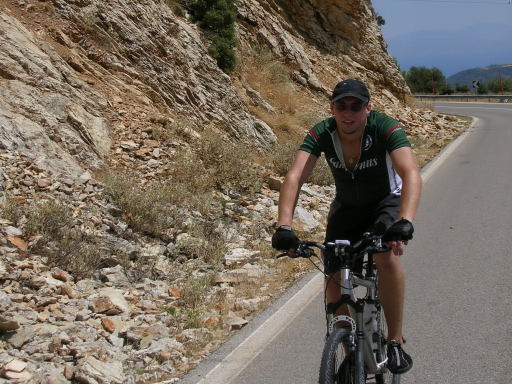 Jetzt eine rasante Abfahrt! Ich freue mich schon wie ein Tiger auf Roy! Irre schnell geht's abwärtig. Dass mit meinen Bremsen was nicht stimmt, merkte ich schon am Vortag am Parnonas, konnte jedoch nicht definieren was genau es war. Als ich nach der Flasche greife merke ich, dass unweit vor mir die nächste Serpentine beginnt und bremse instinktiv, mit nur der linken Hand am Lenker. Nach circa drei Metern in der Luft denke ich mir: "…das wird wehtun…" Tat es dann auch. Nach etwa einer Minute taucht Robby auf und hilft mit, mich und meinen Kram von der Strasse zu sammeln. Nach intensiver Cetavlon - Behandlung und erfreulichem wieder anspringen des Walkman rollen wir weiter abwärts, als es auf einmal wieder aufwärts geht. Konnte ich mich nicht dran erinnern, dass das Streckenprofil diesen Anstieg noch für uns bereithielt. Etwas um die hundertfünfzig Höhenmeter noch mal nach oben, des hätts net braucht!