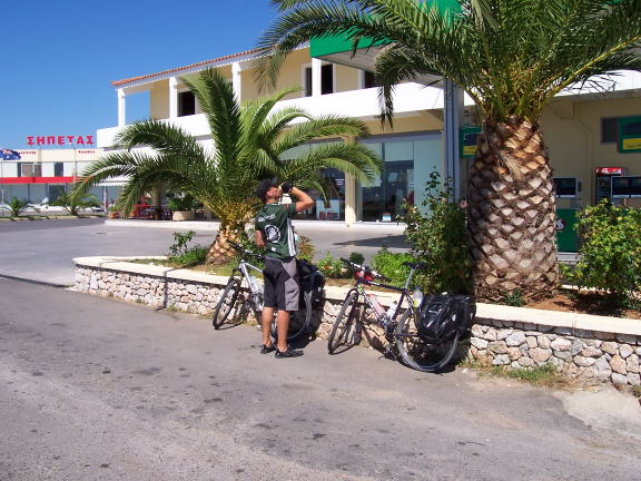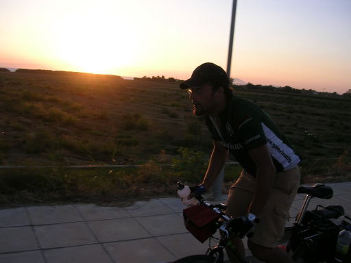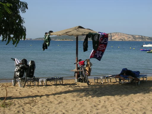 Es scheint fünfzig Grad heiß zu sein, am ganzen Körper läuft die Suppe runter. Tatsächlich hat's nicht mal 40°C und die Sonne steht auch schon recht niedrig. Auf der kurzen Abfahrt nach Pylos, Westpelloponnes prügelt uns ein arger Wind von Westen entgegen. Wir erreichen den Zielcampingplatz, mit Engländer an der Rezeption am Abend. Es ist angenehm die Wunden endlich richtig auszuwaschen und was zu essen. Cetavlon, Relaxat, Schlafsack am Strand, Biers, pennen.