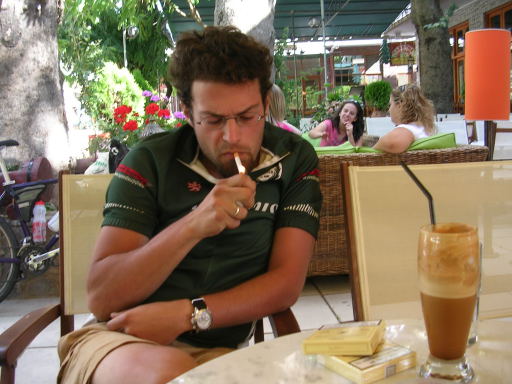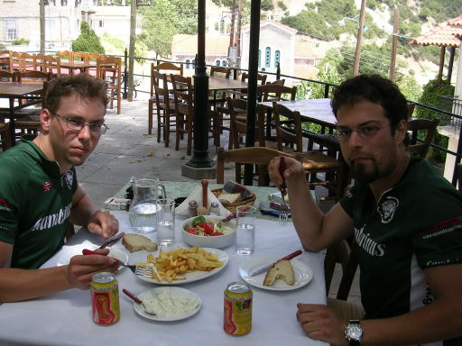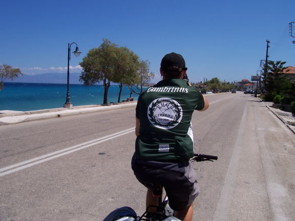 Irgendwas ist ja immer und so musste auch dies Jahr was sein. Nach einigen Kilometern merkte ich, dass meine rechte Hand gerade beim Schalten nicht so wollte wie ich ihr befahl. Das beeinträchtigte eine Laune auf dem Rest der Etappe entsprechend und der Spaß ging flöten. Der geplante Alkoholkonsum zur letzten Etappe wurde in zehn- Kilometer- Schritten nach hinten verlegt bis wir Hunger bekamen. Zu Schweinefleisch gab's ordentliches, holländisches Bier und nach einer Verdauungszigarette ging es weiter, dem Ende des "Gyros du Pelloponnes" entgegen. Die Sorge um die Hand dominierte und so hatte ich nicht wirklich Lust zu ausgelassener Sauferei auf den letzten hundert Kilometern. Ziemlich ereignislos ging es dann weiter und weiter, Patras entgegen. Hier sollte es Sandwiches als Basis und Ordentlich Bier für den Kopf und die letzten dreißig Kilometer geben. Die Sandwiches waren wie erwartet ein voller Erfolg. Der Gang zu einem exquisit wirkenden Bierhaus erwies sich als Fehler. Wir exten schlecht gelaunt je einen halben Liter, um am Kiosk noch ein Mythos aus der Dose draufzukippen. Irgendwie trotz Finisher - Laune, kein richtig erfolgreicher Tag. Die restlichen Kilometer gingen auch spurlos an uns vorbei und bei Lampiri, vier, fünf Kilometer vor Longos, trennten wir uns. Robby fuhr direkt Richtung Longos, ich machte einen Schlenker Richtung Lampiri um meine Cousine zu besuchen, dies ohne Erfolg. So rollte ich selbstzufrieden und gelassen die letzten ruhigen Kilometer in mein Dorf. Ein erhebendes Gefühl, daheim anzukommen, von Freunden erwartet und zur Feier begrillt zu werden. War ein weiteres Mal schön!