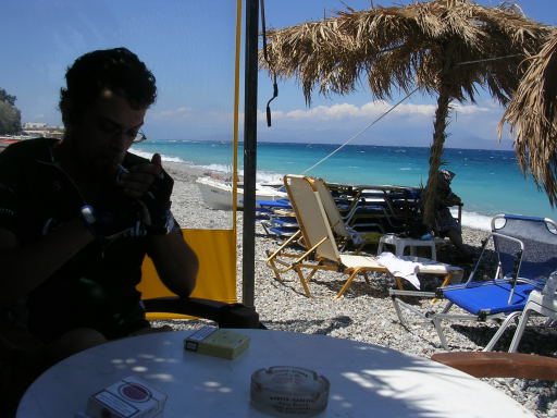 Gerade nach dem Sturz und so. An einer serpentinenreichen Wand findet das Ganze ein Ende und es geht abwärts nach Kalamata. Hier essen wir am Strand ordentlich Schwein vom Grill. Die Reisekasse ist längst am Boden und wehrt sich längst nicht mehr gegen die ständigen Vergewaltigungen. Von Kalamata aus fahren wir über hügeliges Land geradlinig nach Pylos, wie letztes Jahr, nur andersrum. Die Hügel scheinen mir mühsamer zu erklimmen als der Taygetos Stunden zuvor.