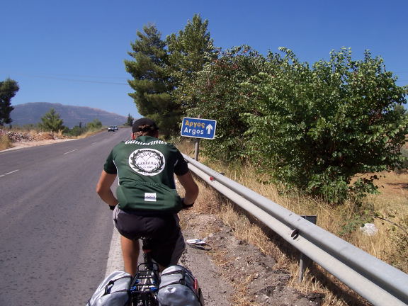 Es ist heiß. Die Landschaft kommt mir richtig bekannt vor. Ach ja, ich war hier schon mal. Damals tat mir der Hintern weh und ich fuhr nordwärts gen Korinth, Robby außer Sichtweite und schlimmer Schmerz. Da geht's mir dies Jahr deutlich besser. Gemeinsam erreichen wir einen Bahnübergang, der grob den höchsten Punkt des Passes markiert und abwärts geht's nach Argos. Ein Wespenstich, den mir ein ins offene Trikot verirrte Tier zufügt ist mit der Allheilsalbe "Cetavlon" versorgt und wird schnell vergessen.