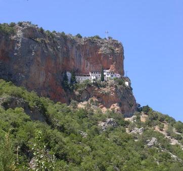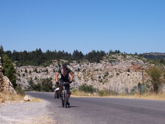 wo wir in Anbetracht des direkt danach beginnenden Berges "Parnonas" was spachteln wollen. Dies tun wir gegen halb zwölf und beginnen wie es sich gehört, in der derbsten Mittagshitze mit der Auffahrt. Yeeehaaaw!! Konstante Steigung für mehrere Kilometer bis es nach einer Weile etwas flacher wird und wir an einer Quelle die Flaschen füllen und ein Kloster an einer Steilwand sehen. Ach! Richtig! Da müssen wir ja dran vorbei! Ich erinnere mich plötzlich. Pilger und so…! Weiter geht's den Berg hinauf, die Höhenmeter machen sich längst optisch am Umfeld bemerkbar.
