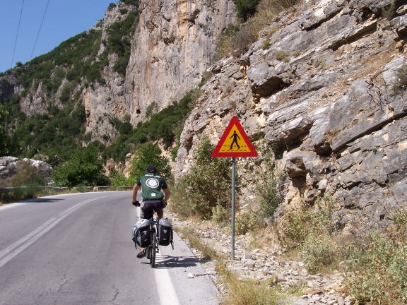 Ich fühle mich nach einigen Kilometern plötzlich prächtig, dennoch halte ich mich an den Rhythmus des ersten Vorsitzenden. Der weiß wie das geht, mit dem Bergauffahren. Steile Serpentinenpassagen, trockene, heiße Luft und das Wissen um den Berg der vor uns liegt lehren mich respektvolle Ruhe zu bewahren. Ich folge einfach in apathischem Tritt Robby, der mal weiter vorfährt, mal nur zwei Radlängen Abstand zu mir hat. Es ist verdammt heiß und einsam hier oben, in den Serpentinen des Taygetos. Ich halte es zunächst für eine Halluzination, merke jedoch je näher ich komme, dass hier oben in der Einsamkeit des Berges, nach kilometerlanger Auffahrt, unzähligen Serpentinen und etlichen Höhenmetern, weitab aller Zivilisation ein "Achtung - Fußgänger" Schild seinen Dienst tut.