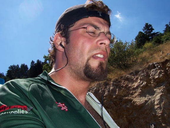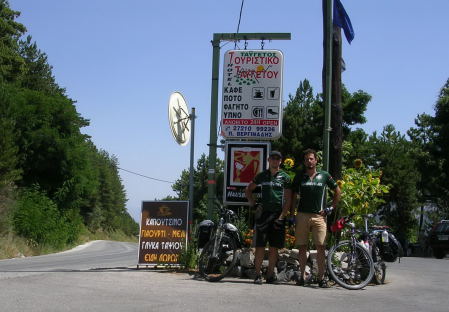 Laut lachend und höchst beglückt über die komische Ader meiner Landsleute fahre ich weiter dem Gipfel entgegen, als Robby überraschend anhält, zur Zuckeraufnahme mittels kalter Feistgetränke. Wieder ziehe ich es vor den Rhythmus zu halten und durchzufahren solange es geht. Es geht erstaunlich gut und flott. Als zusätzlich aus einem Auto laute Bravo- Rufe tönen spüre ich zum ersten Mal im Leben Gänsehaut an der Wade. Das ist das Paradies. Am Gipfel folgt das obligatorische Selbstbildnis und dann ein Klogang. Fünf bis sechs Minuten darauf verlasse ich das örtchen und treffe vor der Gipfelkneipe Herrn W. der gerade angekommen ist. Wir nehmen Frappe und Kippen und Zuckergetränke zu uns und entspannen.