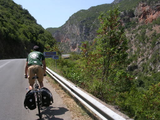 Abfahrt nach Zigarette und Käffchen. Sehr relaxt. Akku aufgeladen und gute Musik auf den Ohren. Es ist schon um kurz nach zehn Uhr verdammt heiß und der Rückenwind vom Vortag ist vom Winde verweht. Sehr viel schneller als ich dachte geht es in die Berge. Direkt nach einer Linkskurve die mir, wie ich glaube aus dem Computerspiel "Collin McRae Rally-2" bekannt ist, steht Herr Würker plötzlich auf und es geht los, die ersten Hügel hoch.